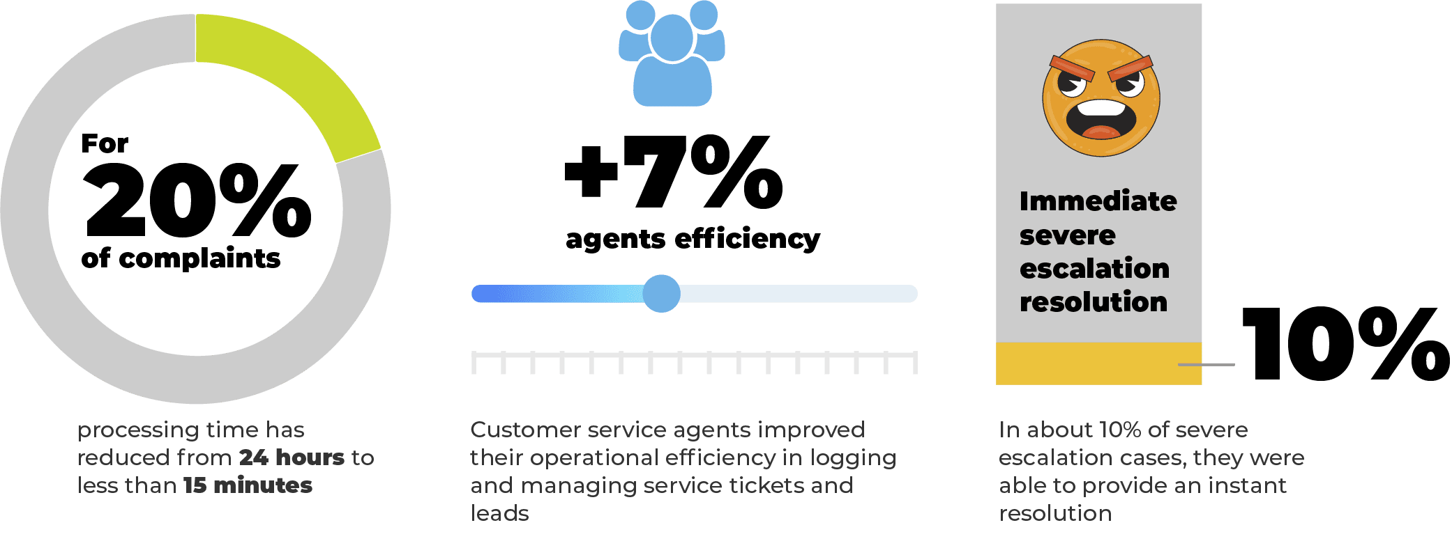 - Enhanced customer experience: The bank’s customer service team reduced the average response time for nearly 20% of complaints from 24 hours to less than 15 minutes. In about 10% of severe escalation cases, they were able to provide an instant resolution